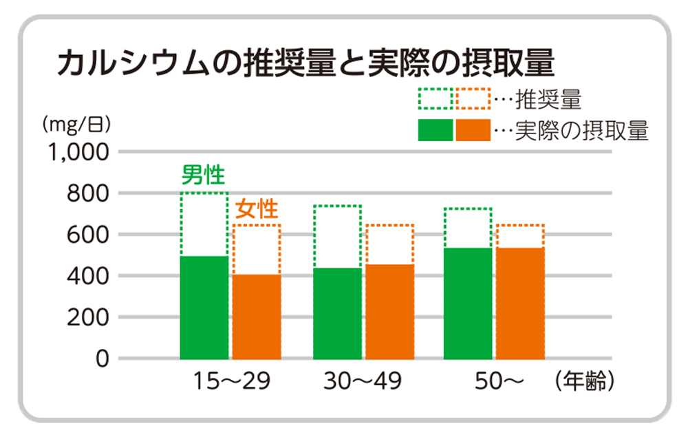 カルシウムを摂取しても骨量の大幅な増加は期待できませんが、骨量の減少を防ぐためには カルシウム摂取が必要です。特に女性は、閉経後に骨量が急激に減少するので注意が必要です。
