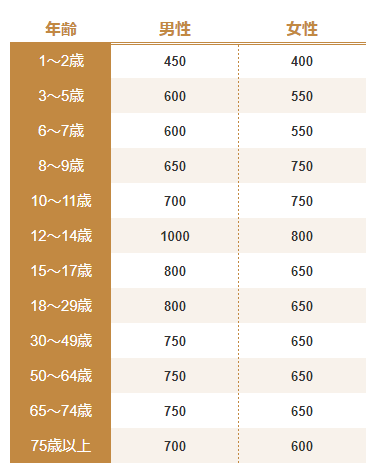 現在、カルシウムの摂取については年齢によって「目安量」、あるいは「推奨量」が以下のように設定されています。
